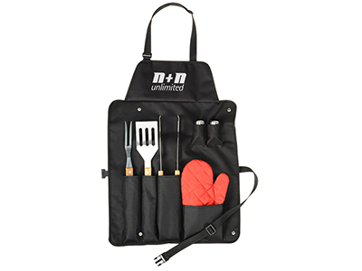 • This handy kit includes an apron, spatula, fork, tongs, oven mitt, and a salt and pepper shaker.