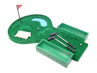 COLORS: Green MATERIAL: ABS SIZE: 41 x 25 x 8.5 cm 1pc Grassland Floor, 2pc Golf Clubs, 2pc Steel Balls and 1 bag San.
