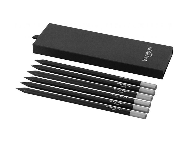 Exclusively designed chic pencil set in black color with silver touch. 6 piece HB sharpened pencils in a luxury gift box.