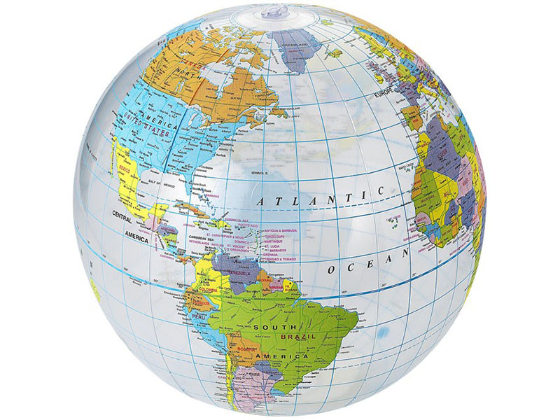 Inflatable beach ball with globe imprint and compliant with EN71.