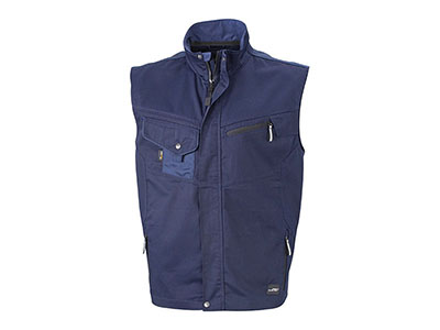 Professional vest with high quality equipment, sturdy and durable mixed fabric, stand-up collar with soft fleece inside, shoulder part reinforced with long covered front zip with wind protection, spacious ventilation openings at the back, side pockets, chest pocket and inner zip pocket. 250g/m2, outer: 65% polyester, 35% cotton, insets: 100% polyamid.