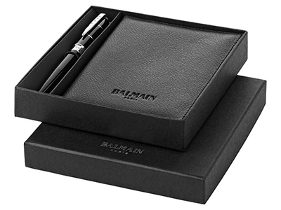 For well-traveled executives, this exclusively designed pen (ø 1,1 x 13,8 cm) and passport cover set is a stylishly practical gift. The high quality ballpoint pen has a shiny finish and engraved design feature on the cap. Packed in a Balmain gift box.
